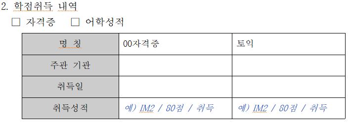 ​ 학점인정신청서 작성 중 취득성적란에는 본인이 취득한 자격/어학의 점수, 등급 등으로 작성